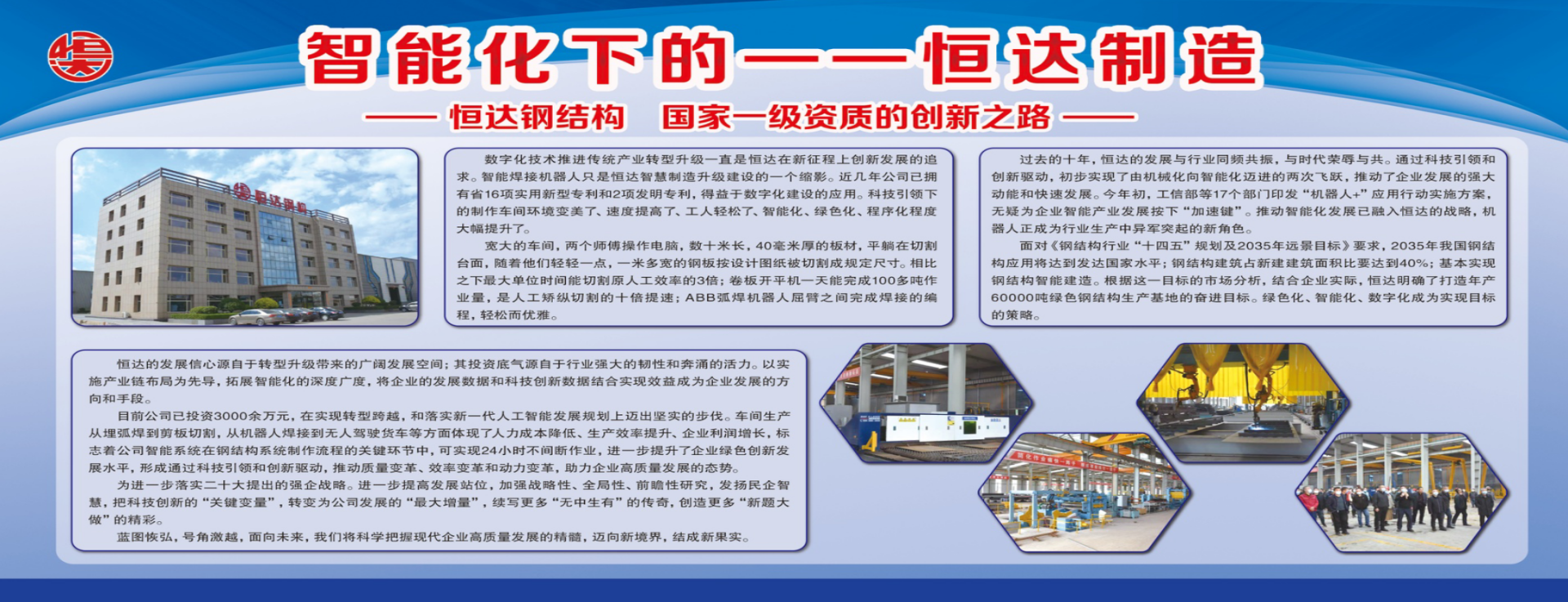 山西恒達鋼結構工程有限公司始建于1998年,位于國家歷史文化名城、晉商故里——山西祁縣,緊鄰208國道,坐落于省級經濟開發區,毗鄰喬家大院景區,地理環境優越,交通十分便利?,F有廠區占地面積200余畝,建筑面積60000平方米。 我公司是一家從事研發、銷售、制造和施工于一體的大型鋼結構工程企業,同時也是涂鍍鋼品及配套建筑圍護材料系統的專業生產廠商。多年來,逐漸確立了以商務寫字樓、賓館、高層住宅等為主的高層鋼結構建筑體系,以大型煤倉、高鐵車站、體育場館等公共建筑為主的空間大跨度鋼結構建筑體系,以工業廠房、低溫物流庫、多層鋼結構建筑等為主的輕鋼結構建筑體系。 我公司現擁有數條輕鋼結構加工生產線、重型鋼結構加工生產線、箱型梁柱加工生產線,同時配套有全自動巖棉保溫復合板生產線、高鐵聲屏障、抑風墻生產線,數控C型鋼生產線及各種規格的壓型板生產線三十余條,擁有年鋼結構加工8萬噸、鋼結構圍護面積120萬平方米的生產能力, [ 查看詳情 ]